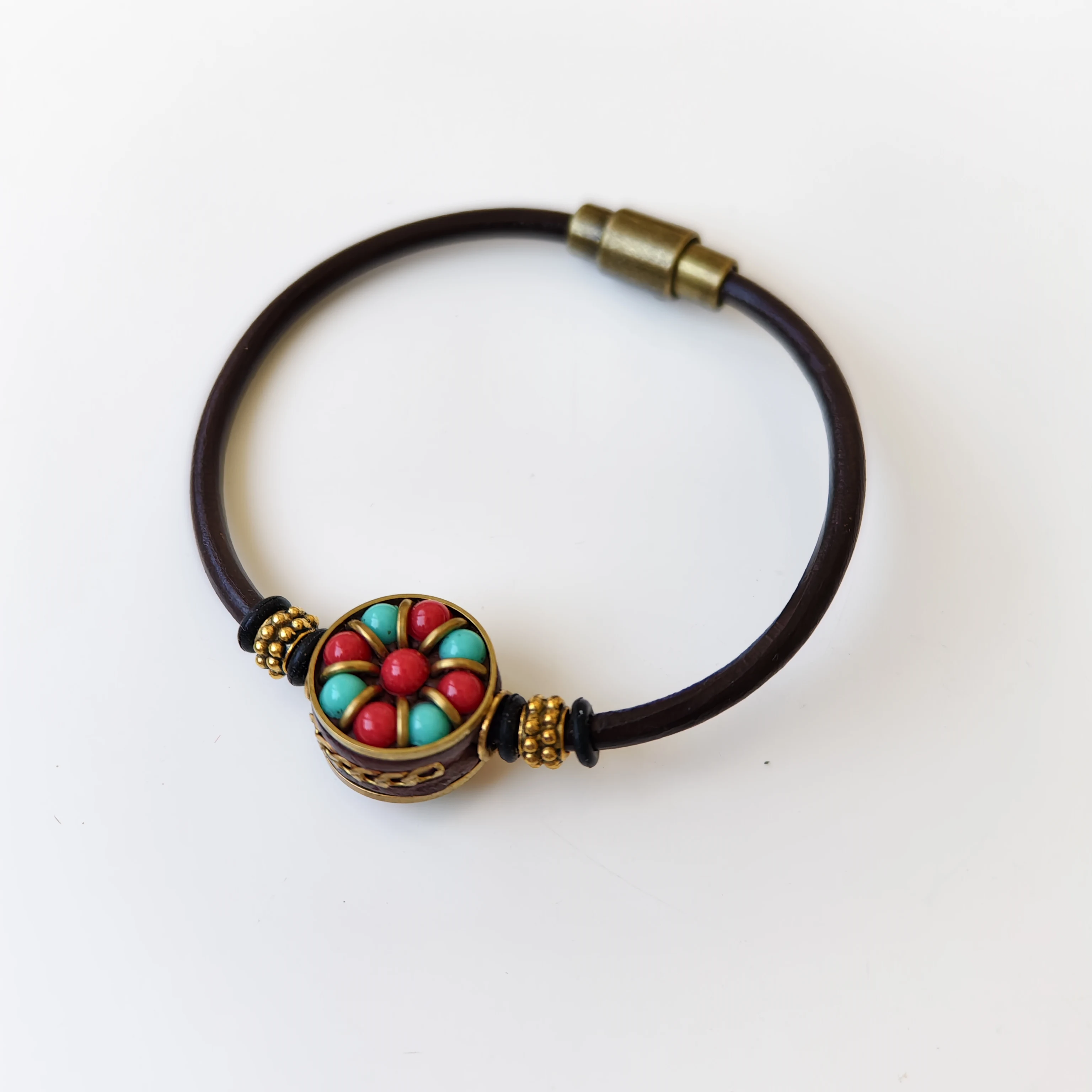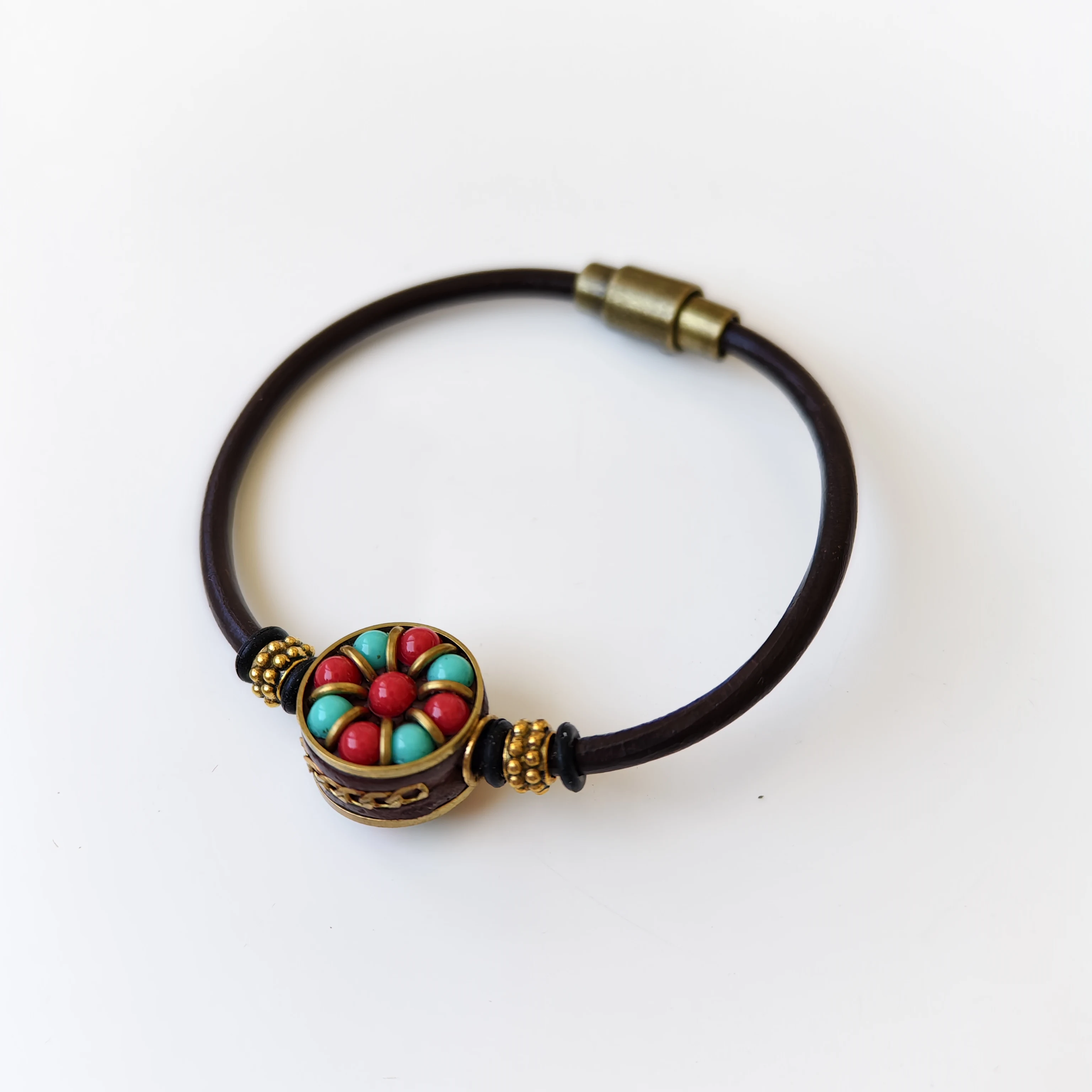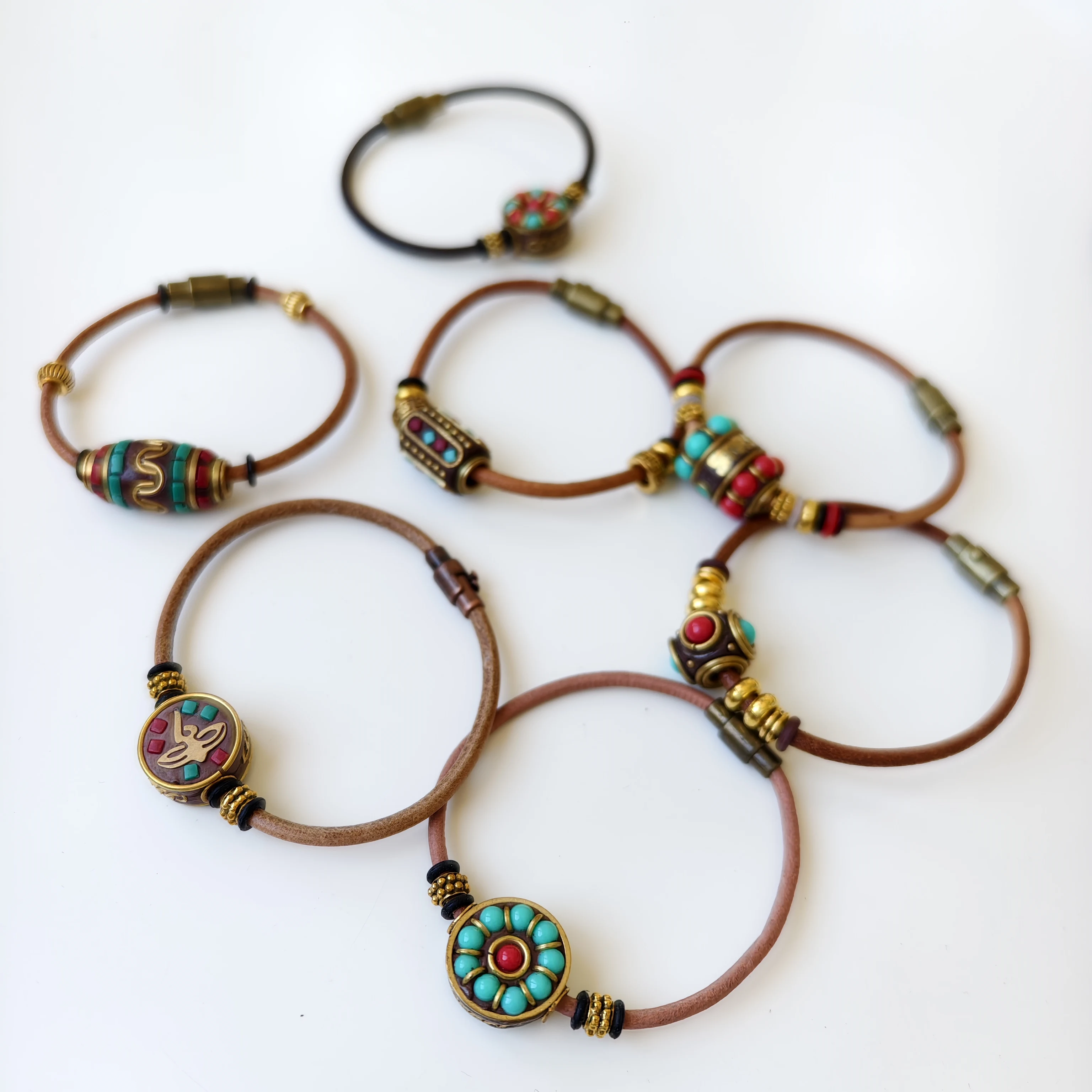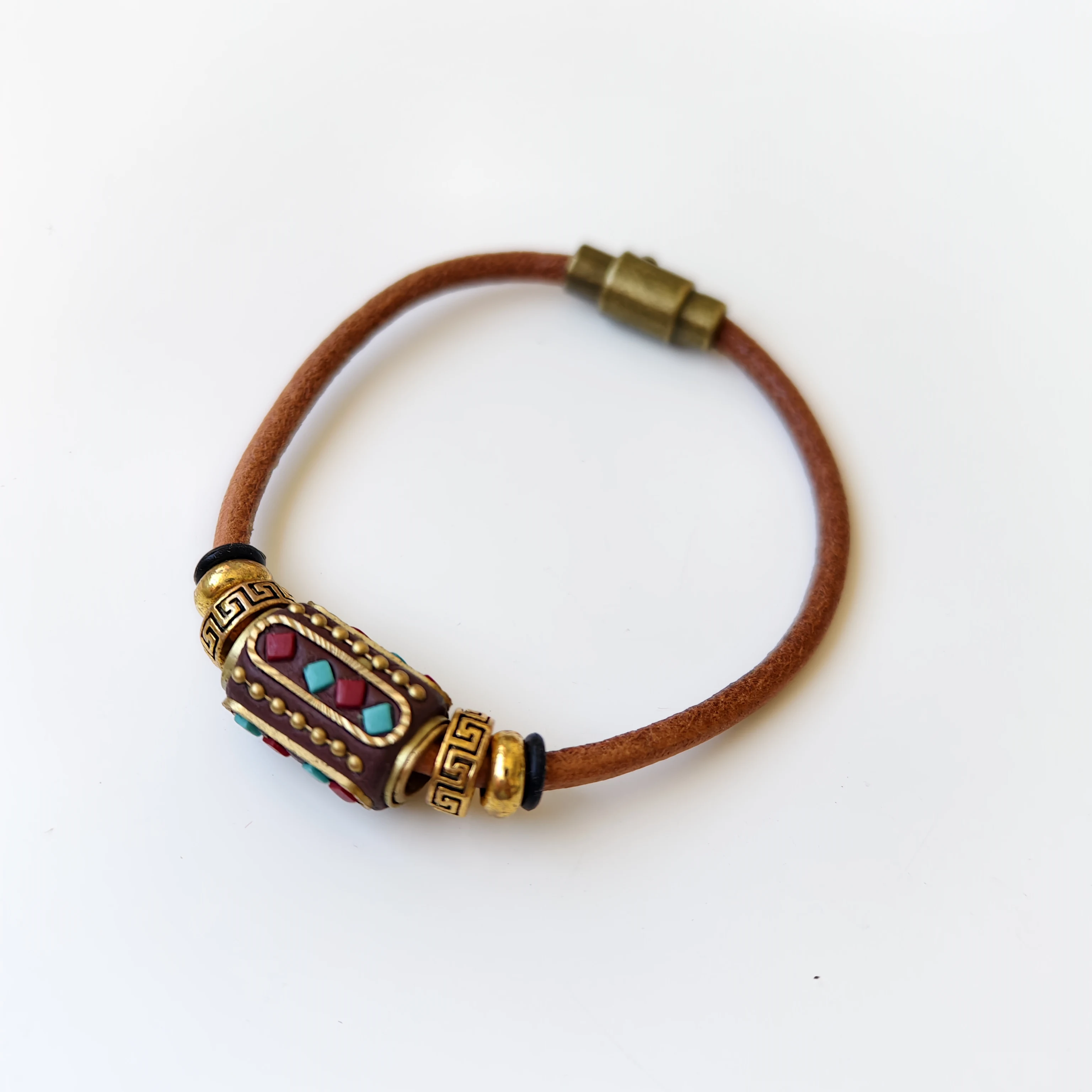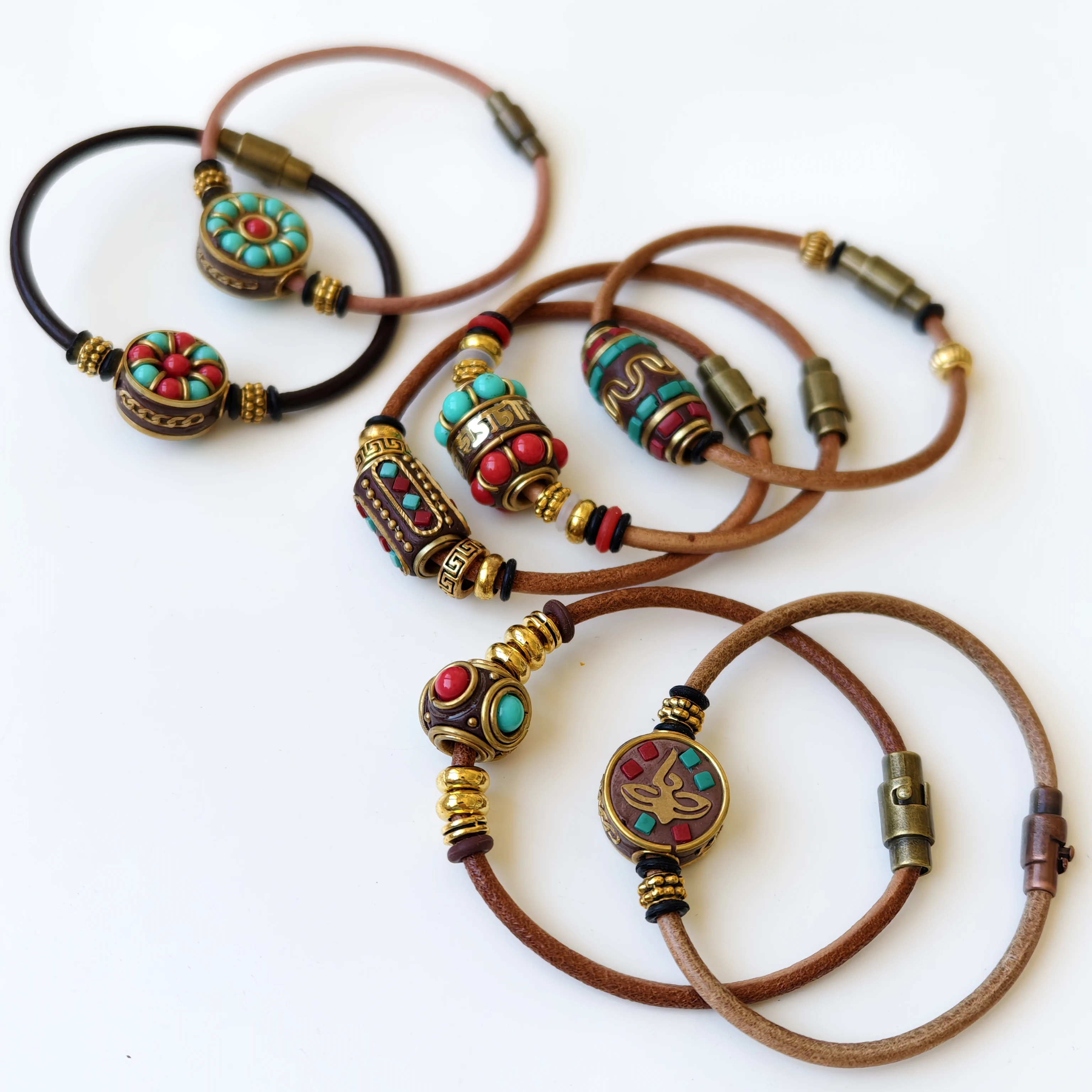 Orginal Design Retro Tibetan-style Leather Cord Wrist Jewelry Handmade Ethnic Nepali Copper Beads Charm Bracelet for Men Women