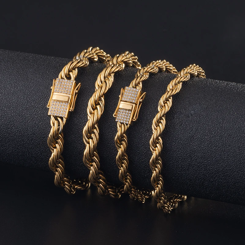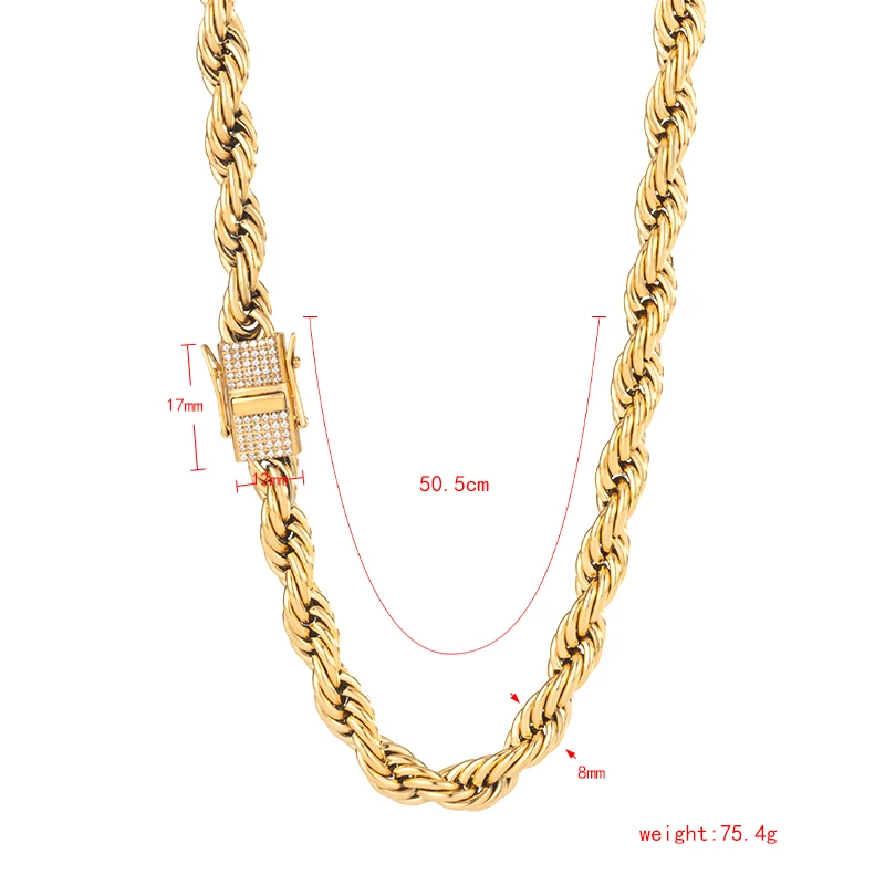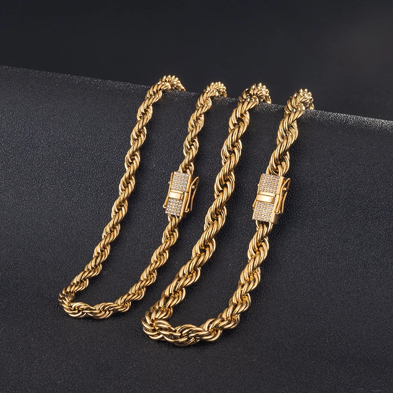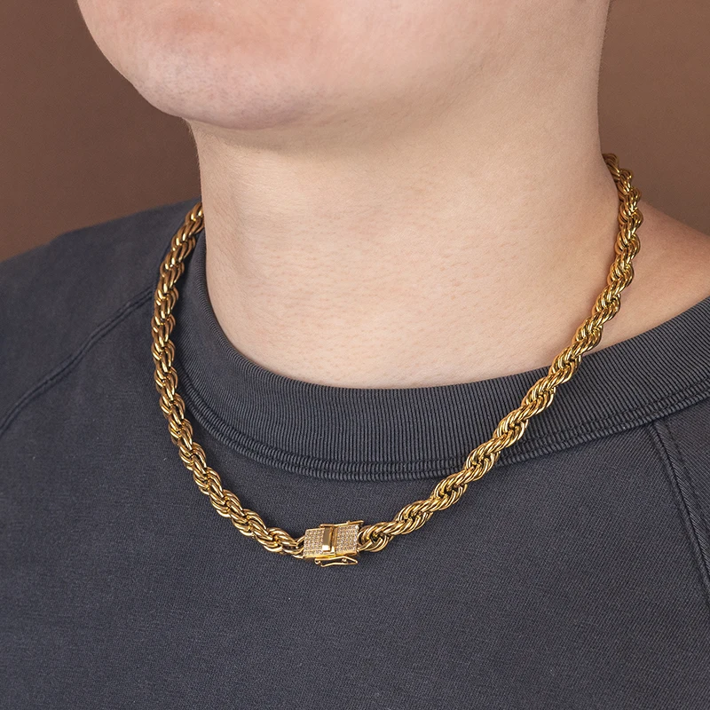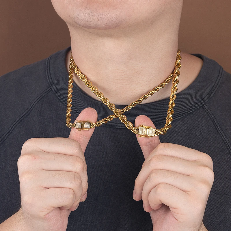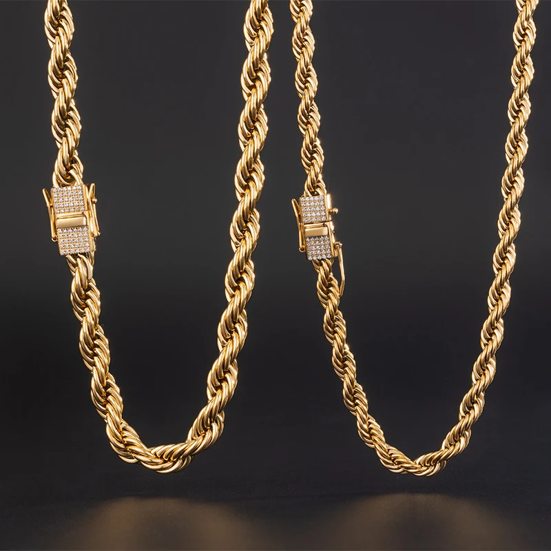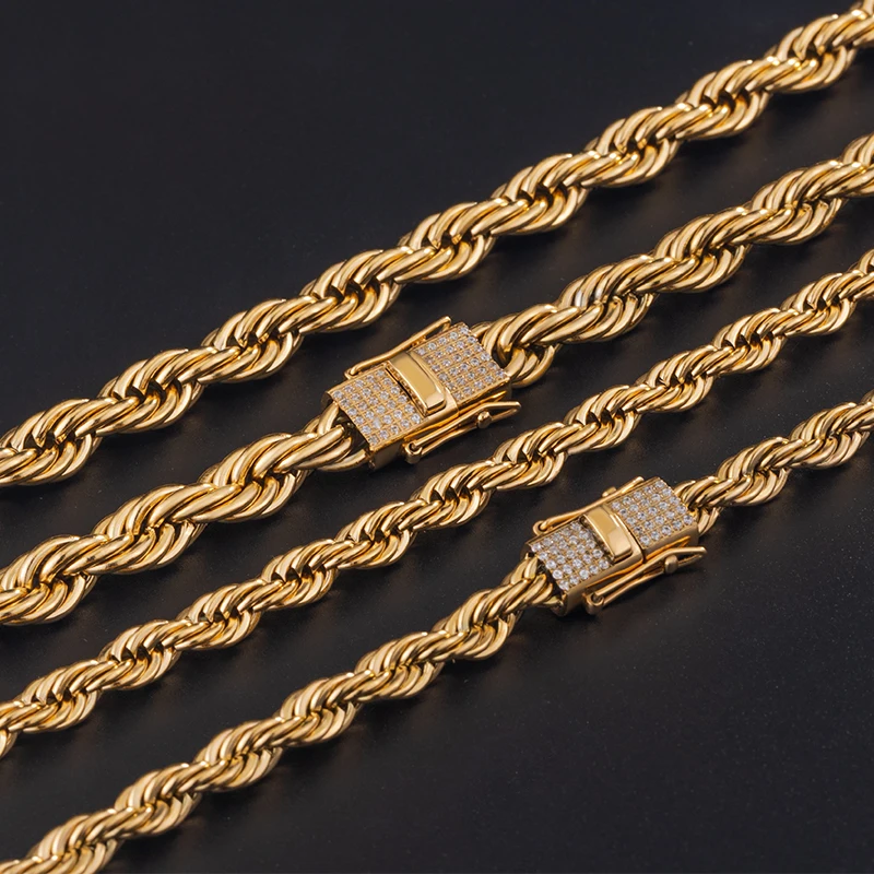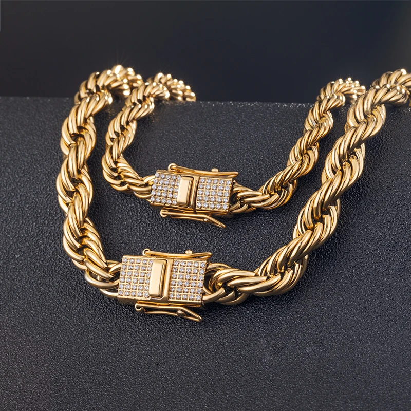 New Style 6MM 8MM Iced Out Clasp Rope Chain 18k Gold Plated Stainless Steel Thick Twist Rope Chain Necklace for Men