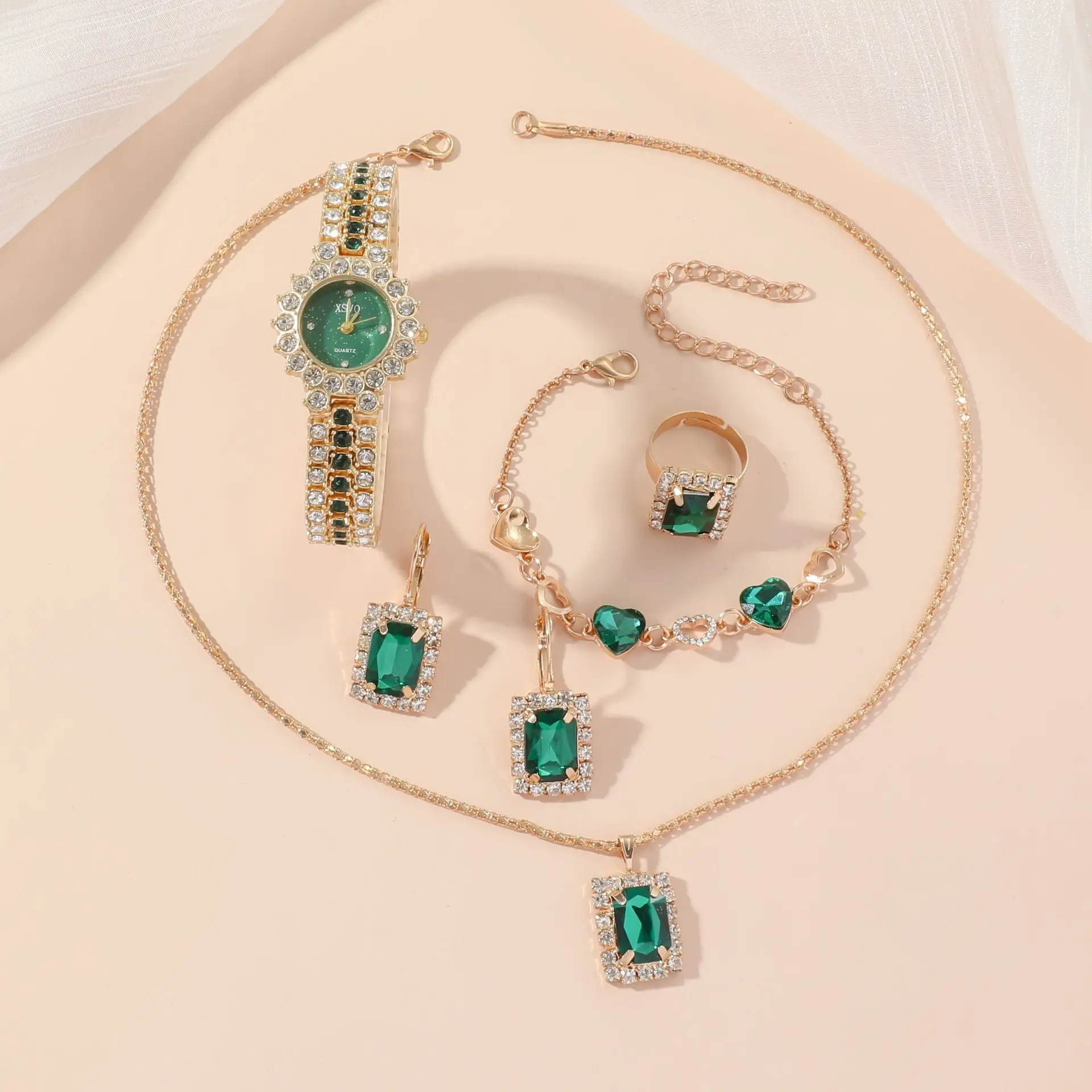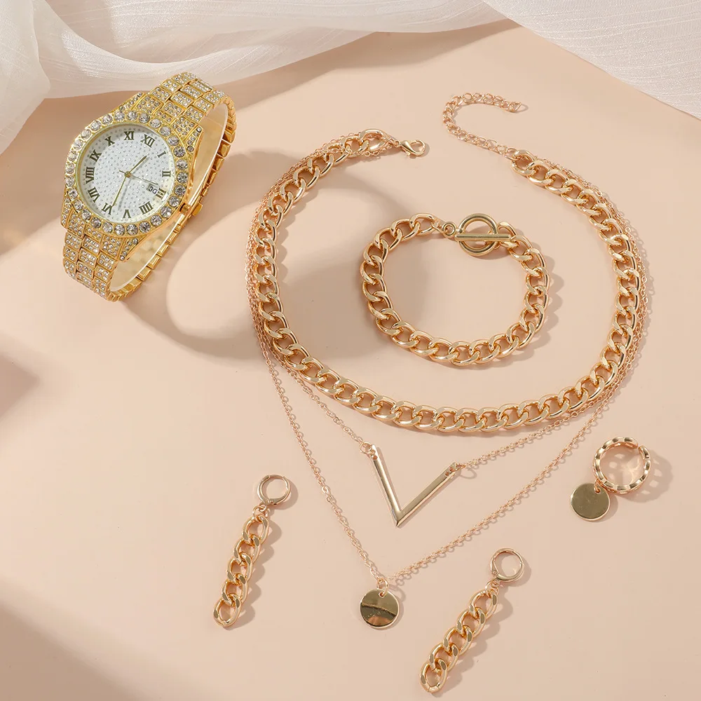 Women Quartz Watch Set Crystal Design Bracelet Necklace Ring Earrings Watch Sets Female Watch Girl Jewelry 5pcs Set